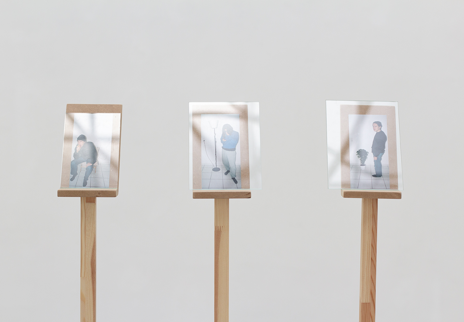 Drei Fotoständer sind im Raum platziert. Auf jedem ruht jeweils eine Fotografie, die eine Momentaufnahme zeigt. In einer Ecke wurden ein Stuhl, eine Pflanze und eine Lampe abgelegt. Die drei Objekte tauchen in den Fotografien auf und schlagen die Brücke zwischen den zeitlichen Abständen.